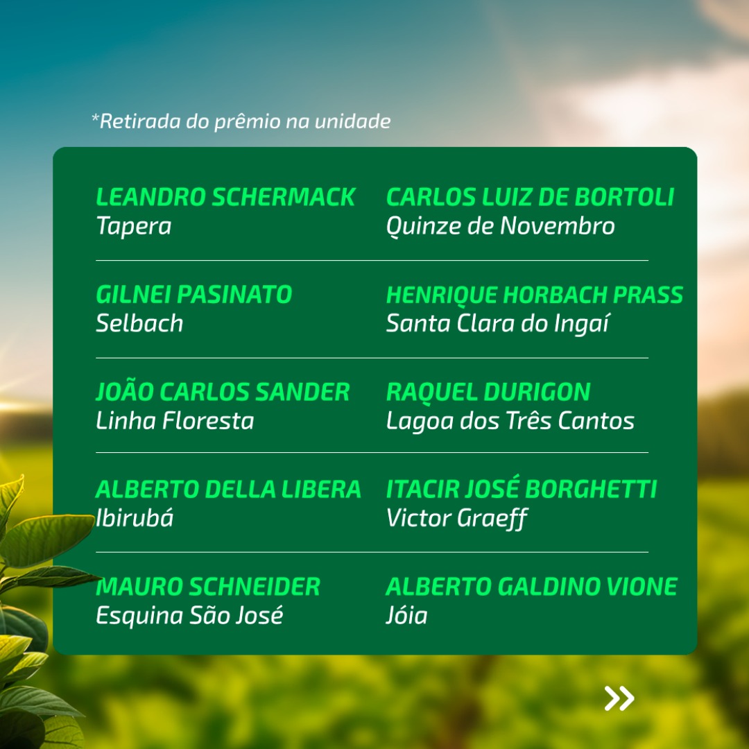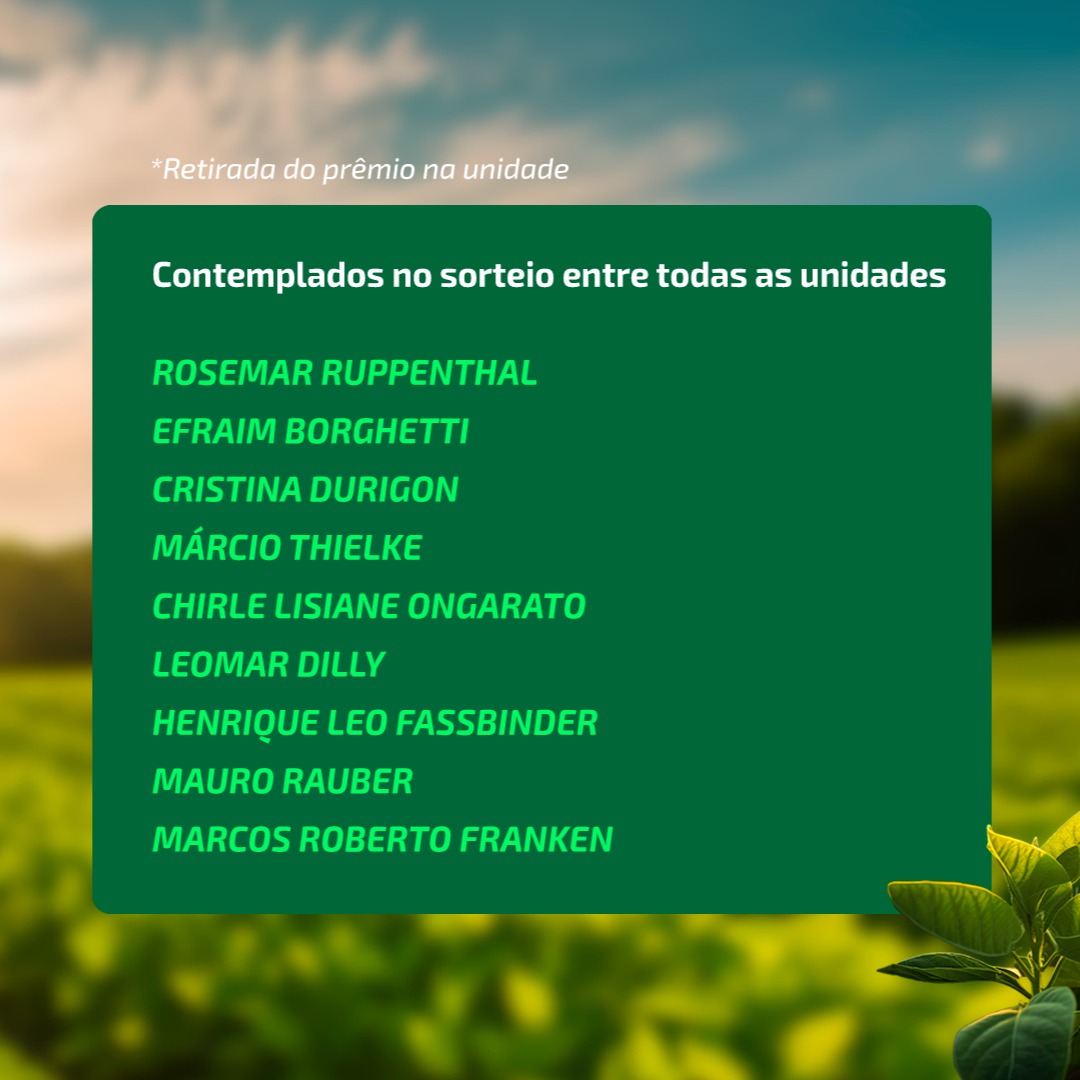 Conforme o gerente de insumos da Cotrisoja, Cristiano Muller, a promoção foi pensada como uma forma de valorizar os associados que fazem seus negócios com a cooperativa. “Além de oportunizarmos a compra de um produto de alto desempenho no combate de doenças – especialmente em um ano desafiador como este-, ainda disponibilizamos esse benefício de premiação. Esta promoção aconteceu dentro das diretrizes do nosso programa de relacionamento Seja Mais Cotrisoja, onde agradecemos a todos os produtores pela participação e parabenizamos aos ganhadores pelo lindo prêmio conquistado” diz.