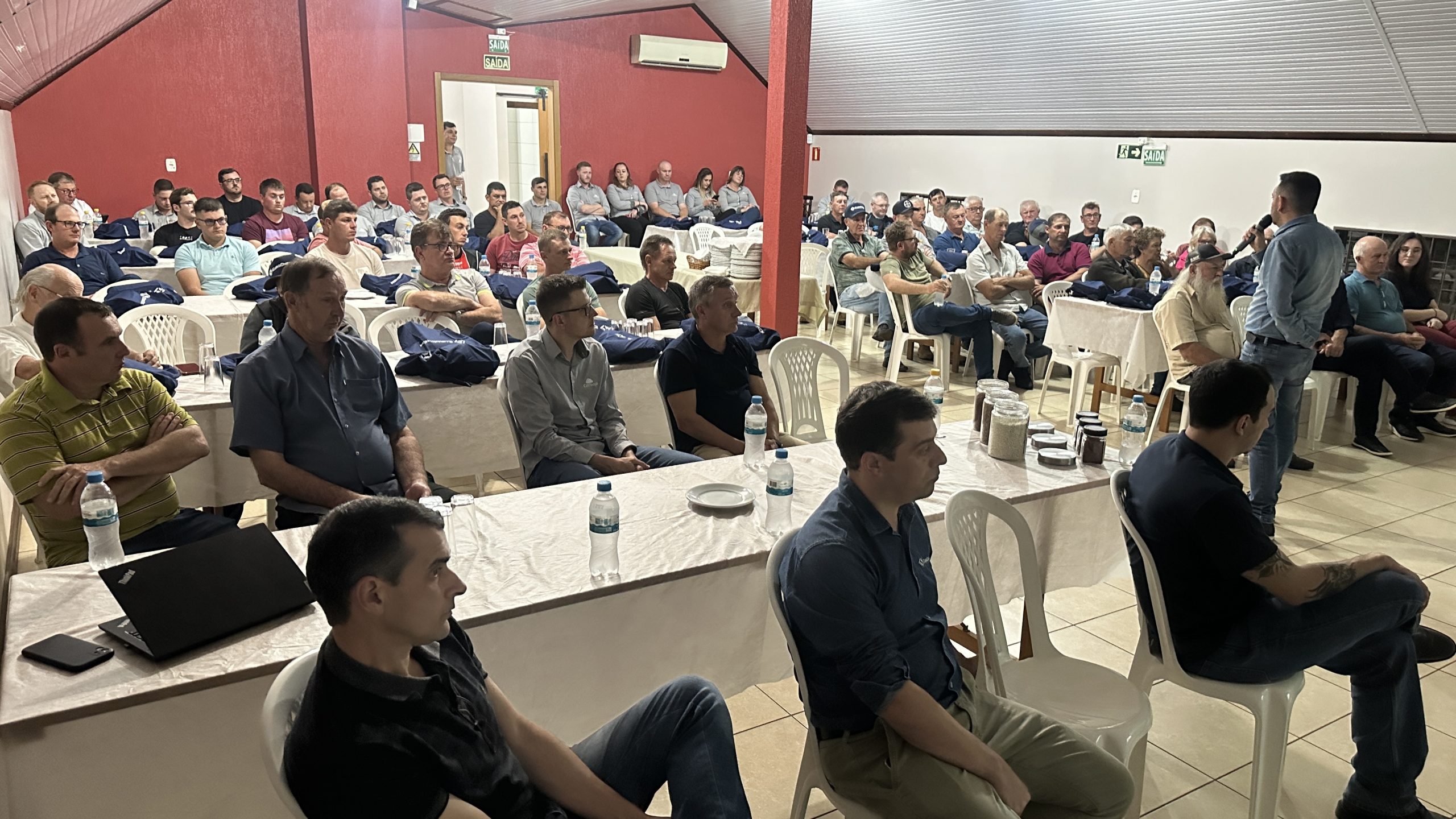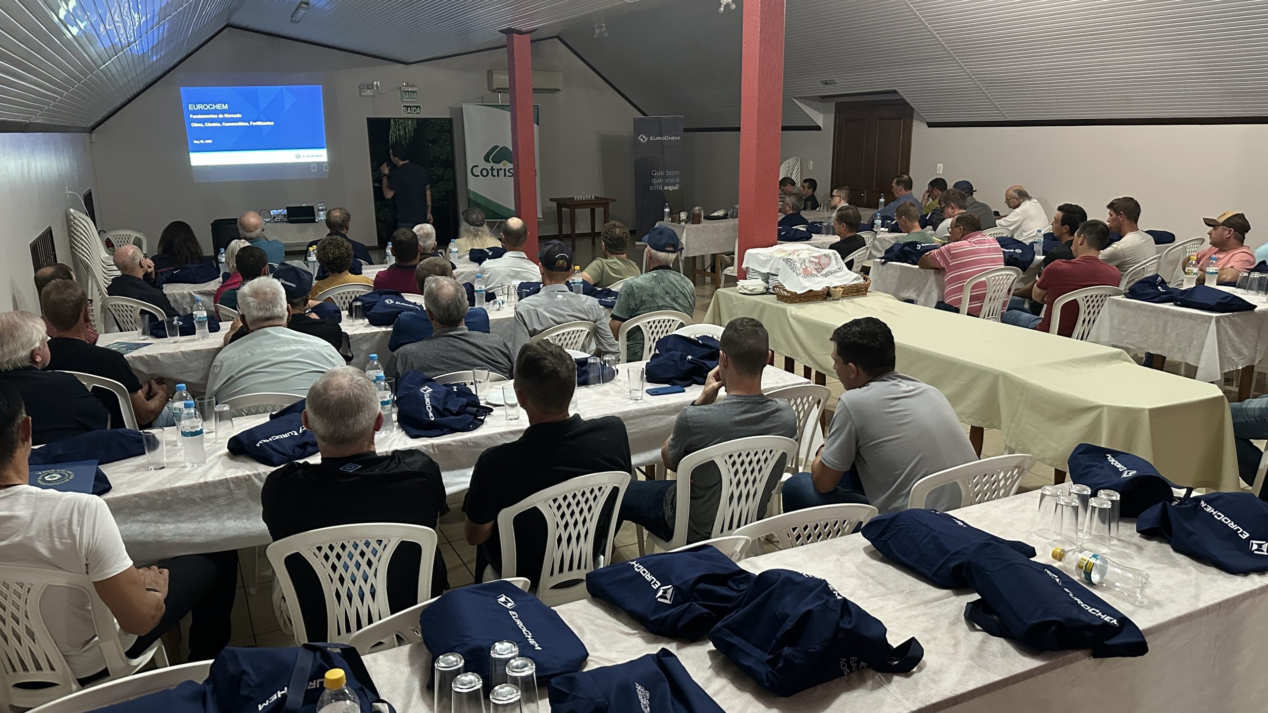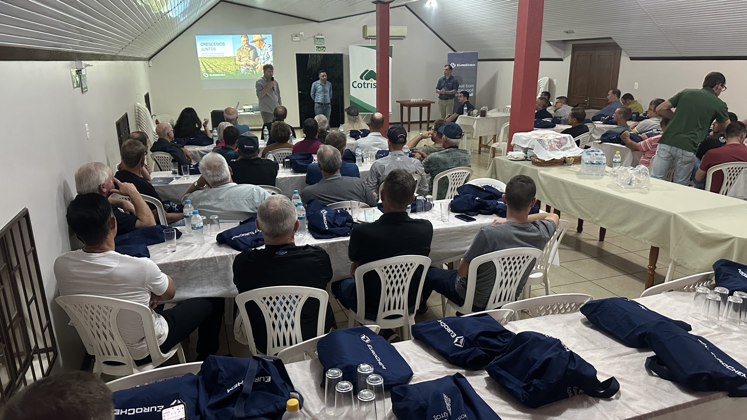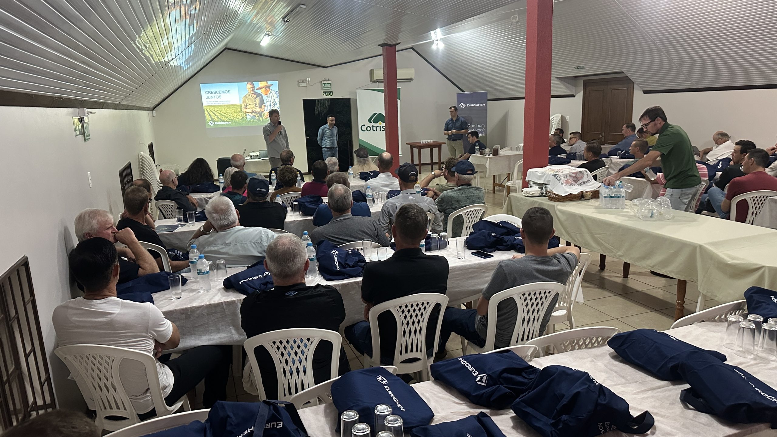 Produtores associados, equipe técnica da Cotrisoja e representantes da EuroChem estiveram reunidos na quinta-feira, 08/05, em Selbach para uma noite de conhecimento voltada ao mercado de fertilizantes e à apresentação do portfólio completo da empresa, que hoje é considerada uma das líderes globais em nutrição de plantas.
